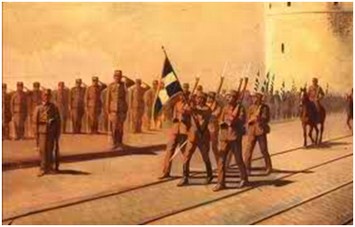 «Προηγούντο περί τους είκοσι σαλπιγκτάς και έπετο ο αξιωματικός σημαιοφόρος με αναπεπταμένην την σημαίαν και τους παραστάτας εφ’ όπλου λόγχην. Ηκολούθει έφιππος ο συντ/ρχης Κωνσταντινόπουλος και αυτόν ηκολούθουν οι λόχοι. Όλοι με γυμνά τα ξίφη των με πρόσωπα ηλιοκαμένα και λάμποντα απο ψυχικήν χαράν...»